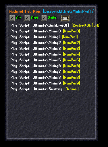 In addition to the client UI for setting up our gump.xml - I have also created a Razor Profile called JaseownsUltimateMiningProfile - you will want to use this file on your miner. It has the correct wait timers but also pre-bound hotkeys and overhead messages.